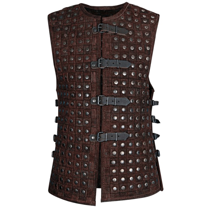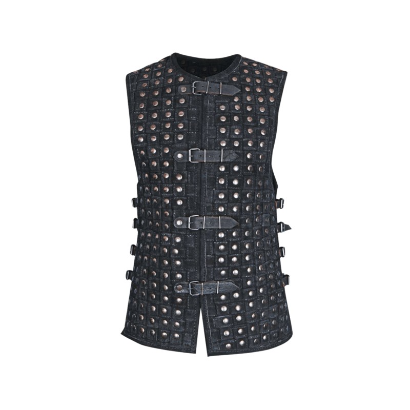 This armor never fails to impress. make of thick, woven straps secured with heavy rivets. Secures with 4 buckled straps in front and buckled straps on the side.