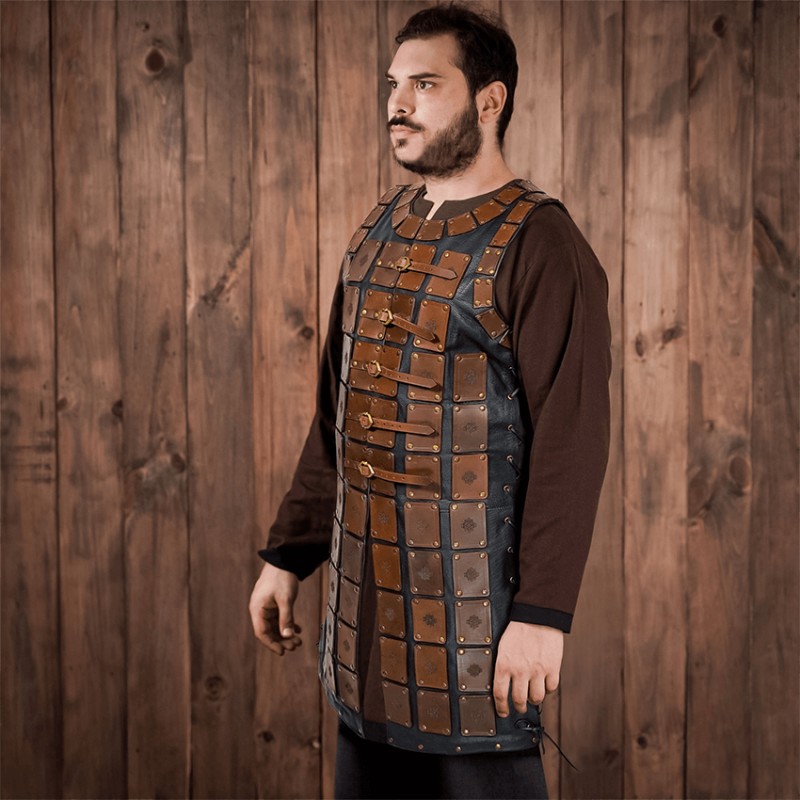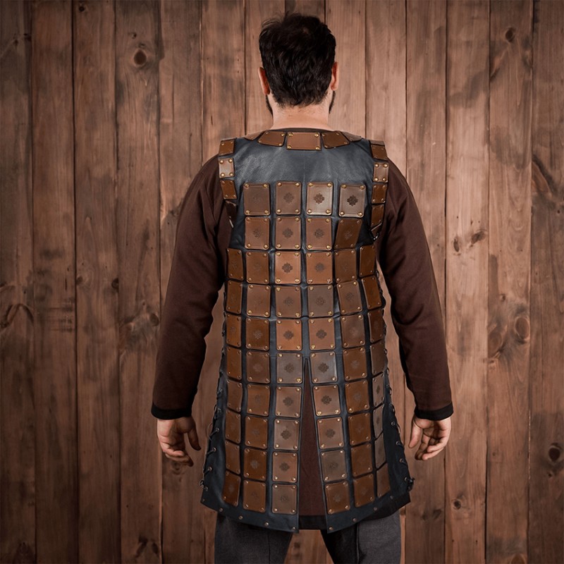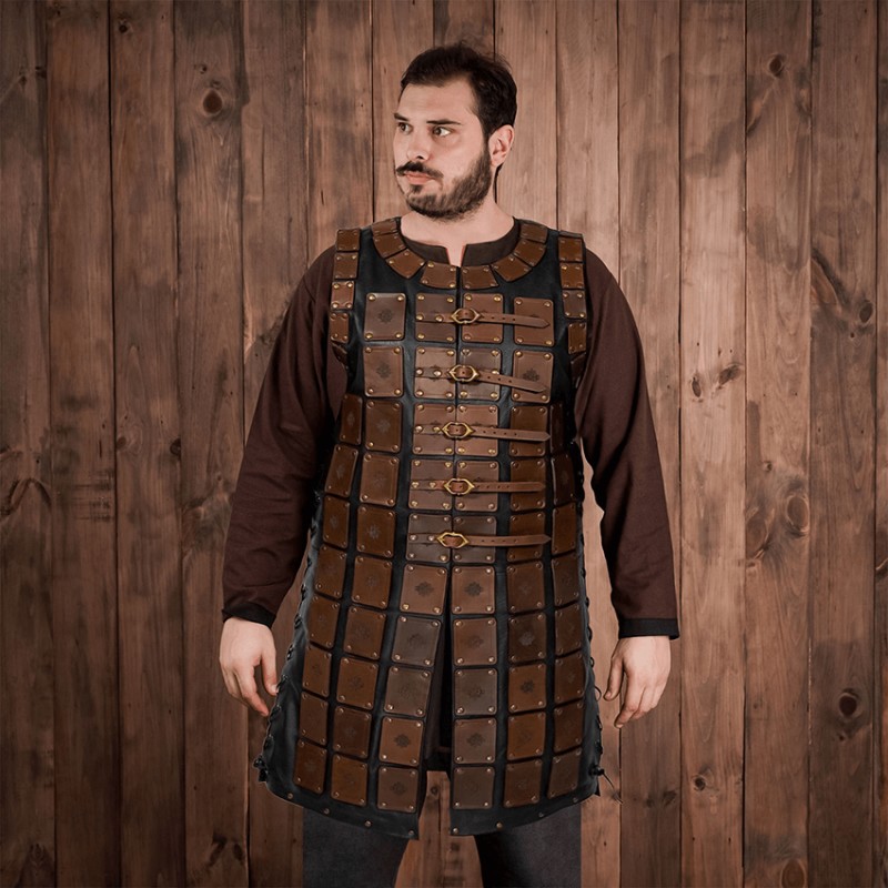 - Attention to Detail: Each brown, rectangular leather plate that adorns the armor features embossed knotwork detailing, adding a dash of intrigue and historical authenticity to the piece.